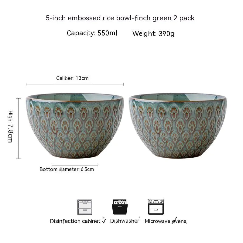 5-Inch Ceramic Peacock Relief Rice Bowl for Household Use