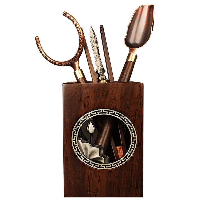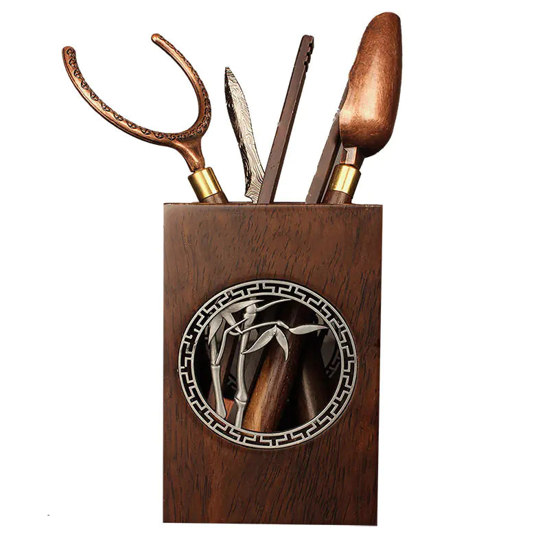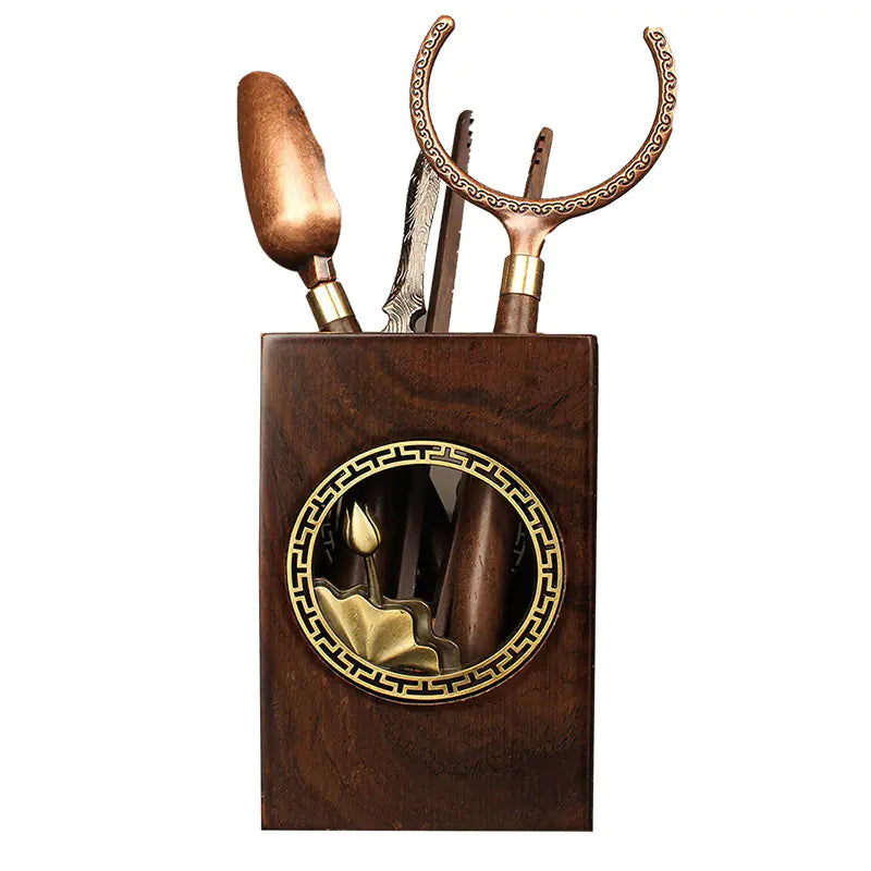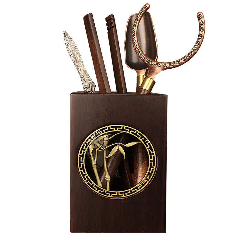 ★★★★★Experience the art of tea with our exquisite Ebony Tea Ceremony Set. Crafted from premium ebony wood and alloy, this luxurious tea set is designed to elevate your tea-drinking ritual into a serene and elegant experience. This sophisticated set includes all the essential tools for a complete tea ceremony, ensuring you can enjoy every sip to its fullest. The set features a thoughtfully designed tea tray with dimensions of 11*7*7 cm, along with a 19 cm teaspoon for precise measurement, an 18 cm cup fork for serving, a 16 cm tea needle for brewing, and a 17 cm cup holder to keep your drinks secure. With options available in various colors—Silver Bamboo, Gold Bamboo, Gold Lotus Leaf, and Silver Lotus Leaf—you can choose the perfect set to match your style and home decor.