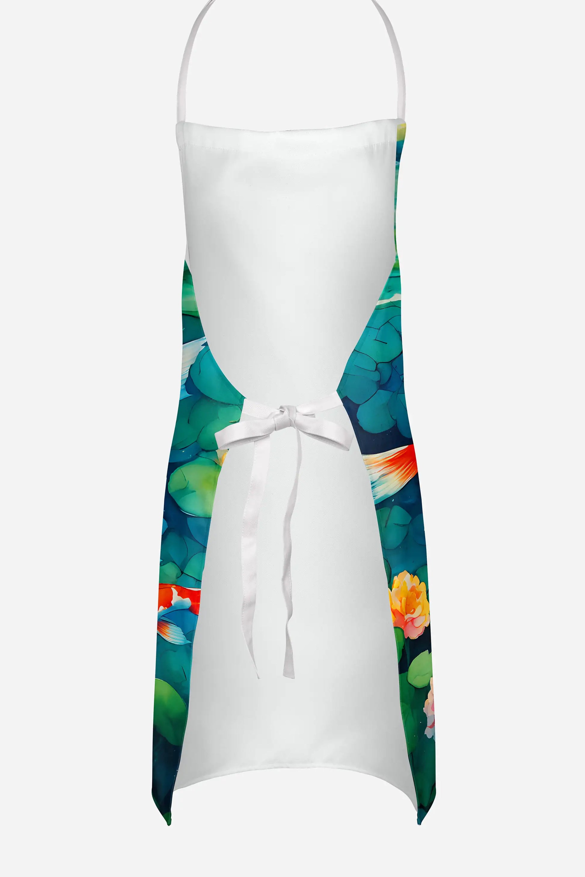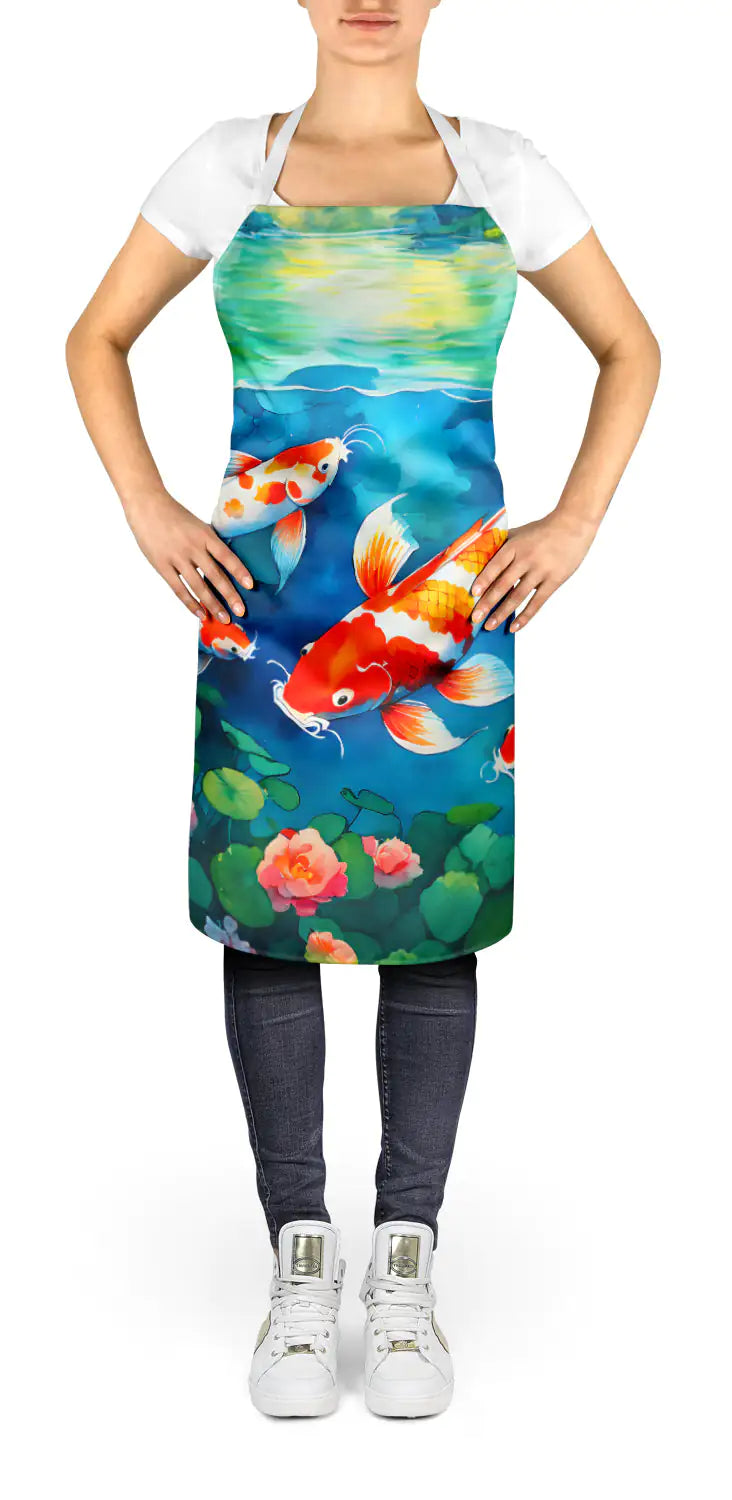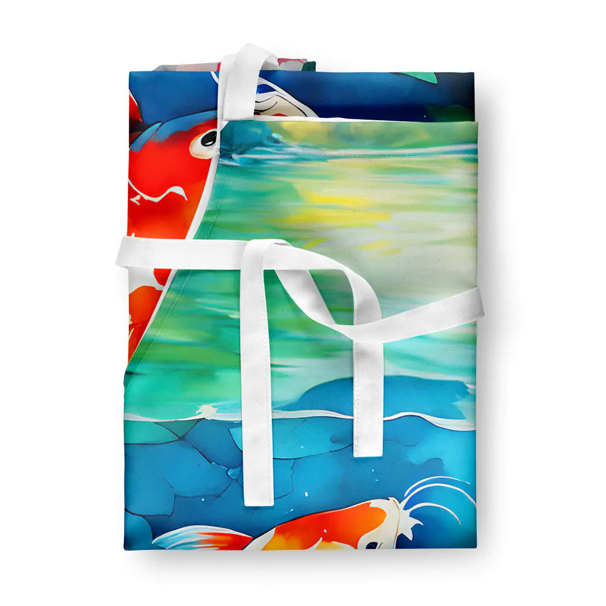 ★★★★★Apron featuring breed specific Koi Fish artwork. Elevate your cooking, baking, and grilling experiences with our versatile Kitchen or BBQ Apron. This Bib Style apron isn't just limited to culinary activities - it also serves as an excellent baking apron, artist apron, server apron, gardening apron, or even a dog grooming apron. The apron showcases vibrant full-color artwork contributed by one of our talented artists, bringing a dash of style to your daily tasks. With dimensions of approximately 27"W x 30"H, it provides ample coverage to protect your clothing from spills and splashes. Our apron is meticulously crafted from 100% Ultra Spun Polyester, known for its durability and lightweight nature. The apron comes with white tie straps, ensuring a comfortable and adjustable fit for all. It's a perfect choice for kitchen apron enthusiasts, whether you are a woman or a man. Designed for easy maintenance, this apron is fully machine washable. The quick-drying polyester material actively reduces staining, keeping your apron looking fresh and new for longer. Our beautifully designed apron isn't just a functional kitchen accessory - it's a fashion statement in the culinary world!