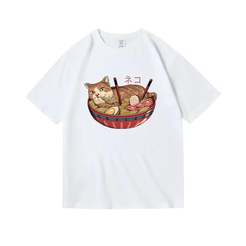 Get ready to turn heads and spark conversations wherever you go with our trendy cat ramen print T-shirt!
